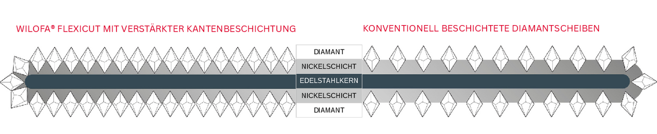 WILOFA® Flexicut Diamantscheiben sind das Ergebnis ambitionierter Entwicklungsarbeit und praktischer Bewährung. Rostfreier Stahl erhielt durch eine spezielle Temperung eine hohe Flexibilität und Rückstellkraft. Im Kantenbereich wurde die Scheibe durch eine spezielle Diamantbeschichtung besonders schnittfreudig und standfest.