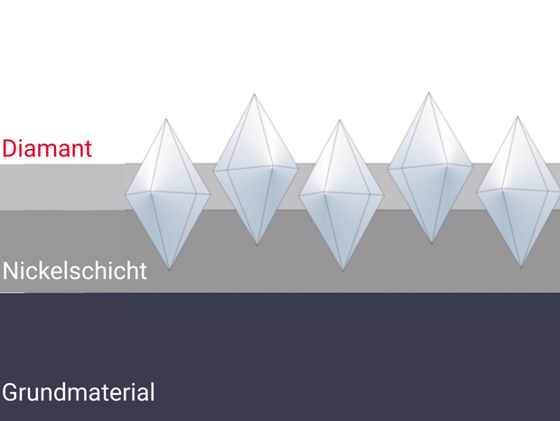 Diamanten, die fast wie Zähne nachwachsen. Repetierbare Diamantbeschichtung in galvanischer Bindungsmatrix.Die mehrlagigen Kornschichten werden von elektrolytisch aufgetragenem Reinnickel fixiert. Ein elektroerosiver Prozess sichert Kühldrainagen für den Substanzabtrag bei der Präparation. Beim Repetieren wird das abgenutzte Diamantkorn freigesetzt; an dessen Stelle tritt ein neues, scharfes Korn.